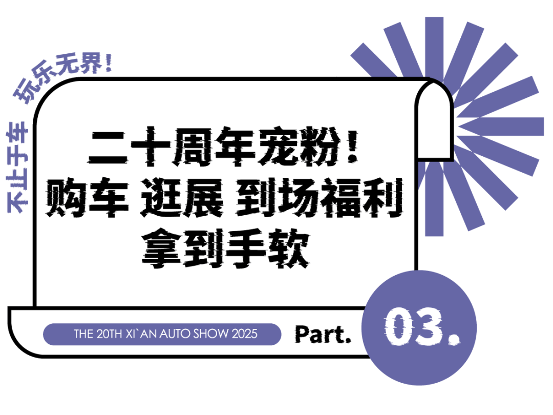 为回馈二十年来公众的支持与厚爱,本届车展推出多重实打实的福利政策,无论是购车还是逛展,都堪称全年最优时机。实力宠粉,福利拿到手软,你的你的都是你的~