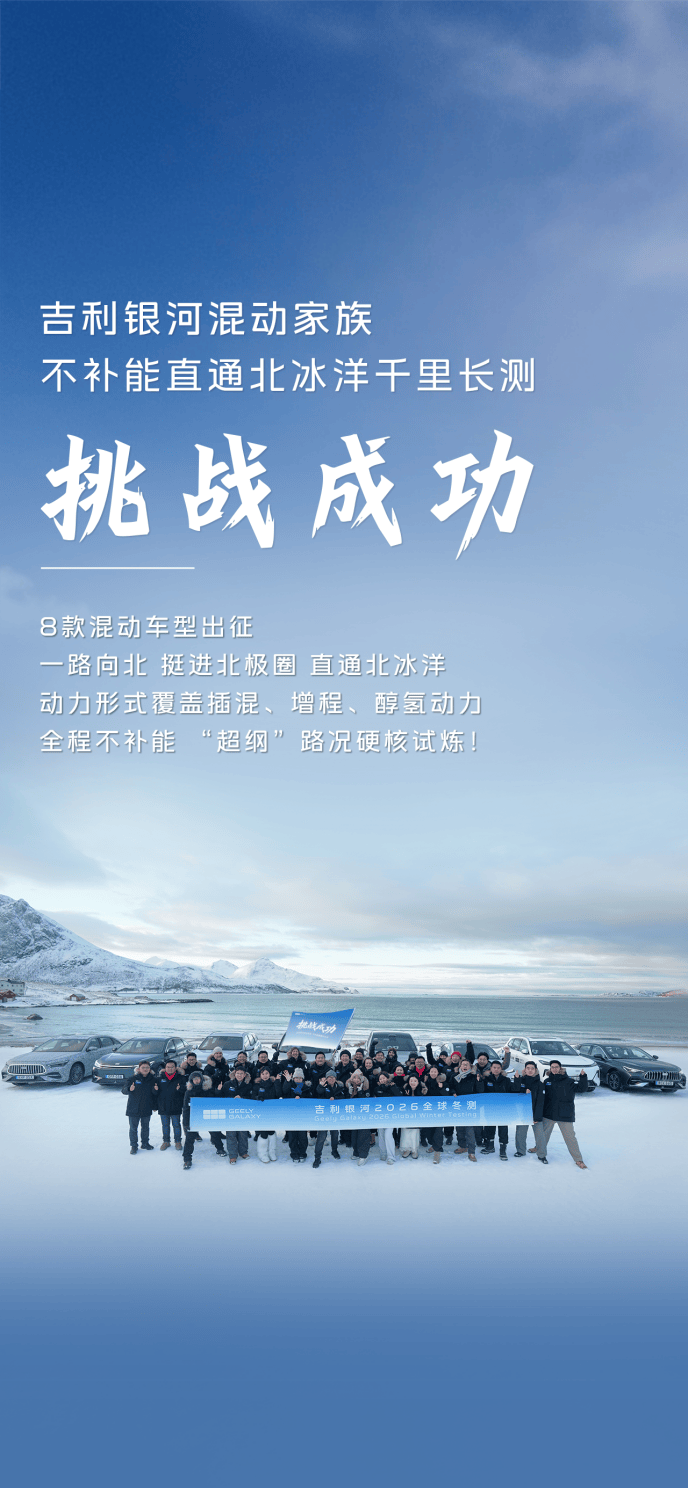 对新能源技术极限的主动验证、对研发不遗余力的大力投入,是吉利银河超越竞品、持续领跑的核心底气。站在2026年1月销量助力吉利汽车登顶中国市场销冠的新起点上,吉利银河正以无畏的闯劲,将“全球研发、全球验证、全域安全”的理念转化为每一位用户触手可及的高价值体验。在全球化征程上,吉利银河已然在北极冰原上留下了属于中国力量的深刻印记,这不仅是“百万银河”时代开启后的首场全球化技术“亮剑”,更是中国汽车工业在世界顶级试炼场上完成的一次壮丽远征。未来,在世界的每一个角落,吉利银河都将像“本地车”一样安全、可靠,以世界的标准,打造世界级好车!